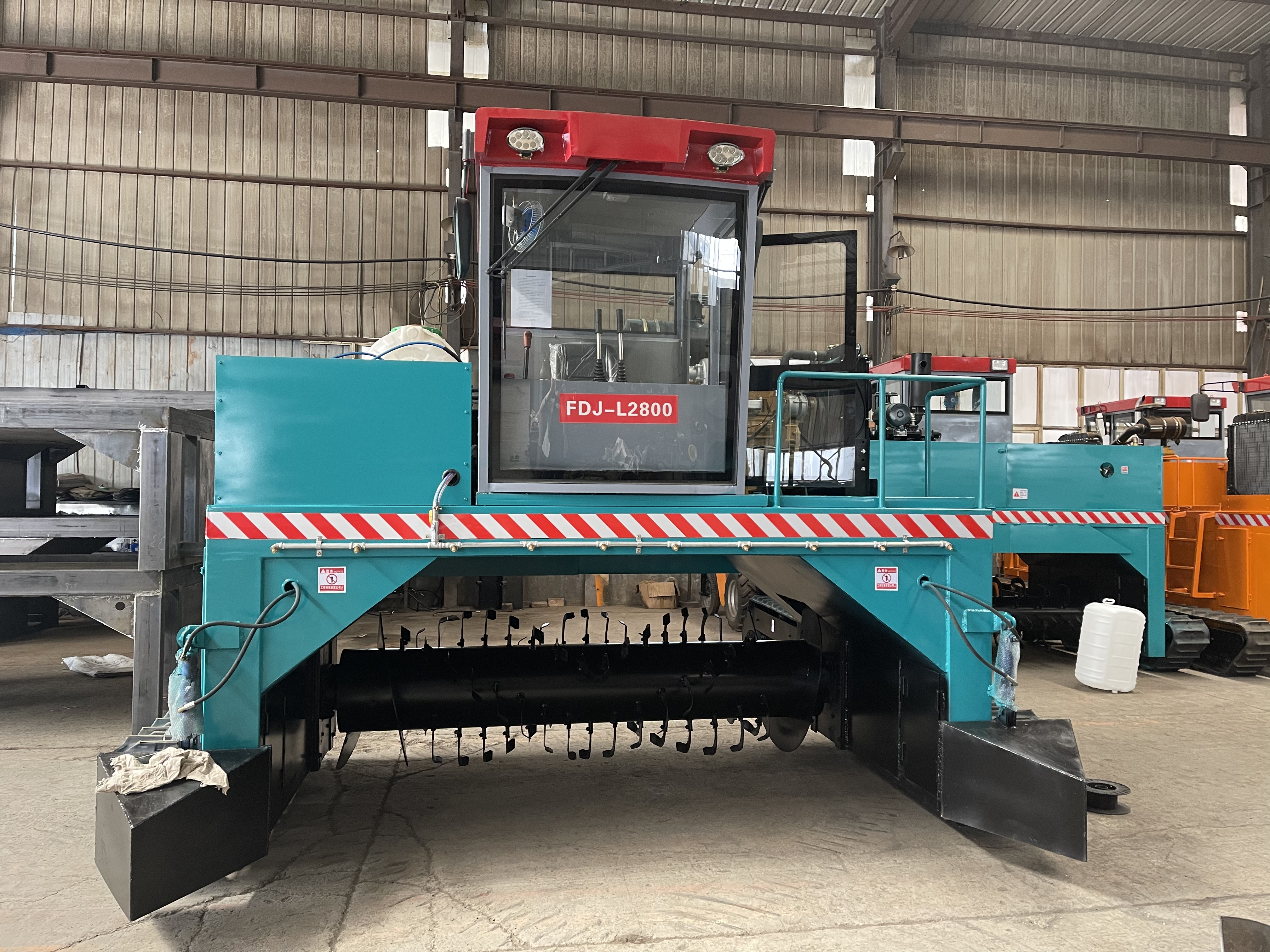 FDJ-2800型機械履帶式翻堆機,水分大的物料原地不會打滑,爬窩現象,不會更換輪胎.拉桿操作原地180°轉彎調頭,淘汰了方向盤式原地無法調頭的煩惱,節(jié)省地,人工柴油。